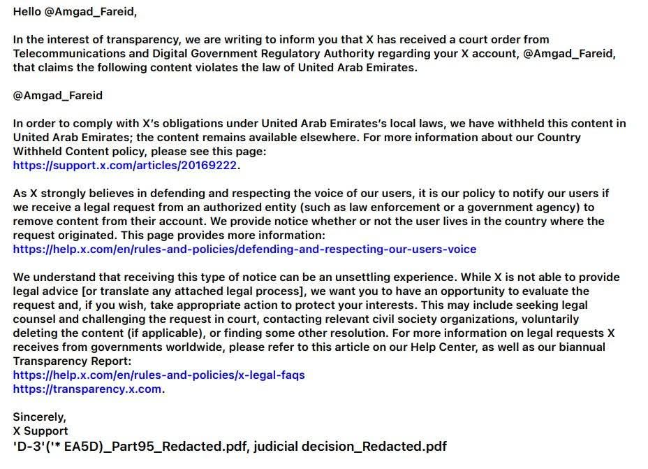 الخرطوم ـ النورس نيوز ـ أفادت تقارير إعلامية بأن السلطات في دولة الإمارات العربية المتحدة أقدمت على حجب الوصول داخل البلاد إلى حساب منصة “إكس” الخاص بأمجد فريد الطيب، المستشار السياسي ومستشار الشؤون الخارجية لرئيس مجلس السيادة السوداني، وذلك استناداً إلى حكم قضائي.